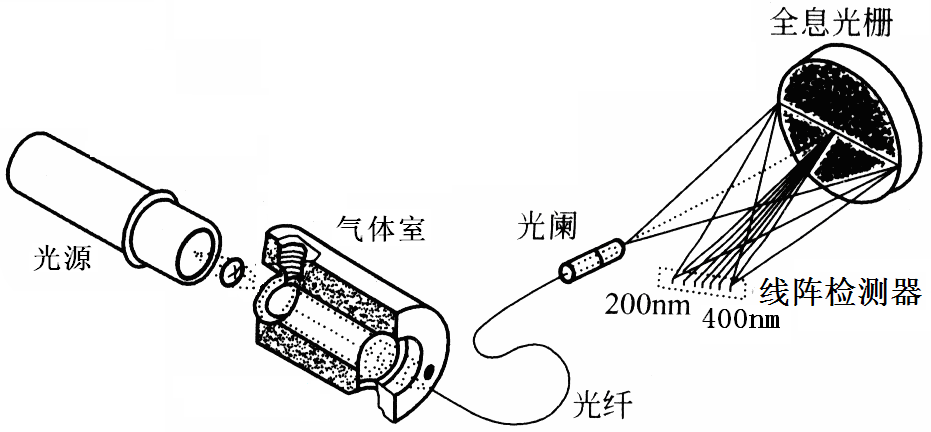 氣體分析儀的工作原理基于朗伯-比爾定律,其分析方法屬于紫外吸收光譜法。分析儀的測(cè)量單元,由光源、氣體室、光纖和光譜儀(含光闌、全息光柵、線陣檢測(cè)器)等組件構(gòu)成。