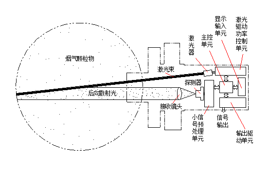 粉塵儀包括激光光源及功率控制單元、光電傳感與小信號(hào)預(yù)處理單元、散射光接收單元、顯示與輸入單元、輸出驅(qū)動(dòng)單元、主控單元。激光器發(fā)出的650nm束以一個(gè)微小的角度射入排放源,激光束與煙塵粒子作用產(chǎn)生散射光,背向散射光通過接受系統(tǒng)進(jìn)入傳感器轉(zhuǎn)變成電信號(hào)進(jìn)行處理。電路部分實(shí)現(xiàn)光電轉(zhuǎn)換、激光束的調(diào)制、信號(hào)放大、解調(diào)、光源的功率控制、V/I轉(zhuǎn)換功能。整個(gè)系統(tǒng)的構(gòu)成包括主機(jī)及校準(zhǔn)系統(tǒng)、吹掃系統(tǒng)、連接附件及防雨箱。