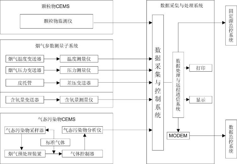 我公司固定污染源煙氣排放連續(xù)監(jiān)測(cè)系統(tǒng)由采樣探頭、粉塵儀、溫壓流一體監(jiān)測(cè)儀、分析機(jī)柜、標(biāo)準(zhǔn)樣氣、管線等組成。其中采樣探頭、粉塵儀、溫壓流探頭安裝于監(jiān)測(cè)點(diǎn)(煙道或煙囪),分析機(jī)柜安放于室內(nèi)。樣氣通過采樣探頭、伴熱管線進(jìn)入分析機(jī)柜,經(jīng)由分析機(jī)柜內(nèi)的預(yù)處理系統(tǒng)進(jìn)入煙氣分析儀,測(cè)量SO2、NOX、氧含量等參數(shù);粉塵儀用于測(cè)量粉塵濃度,溫壓流一體監(jiān)測(cè)儀用于測(cè)量溫度、壓力、流速,測(cè)量信號(hào)通過電纜傳輸至分析機(jī)柜內(nèi)的數(shù)據(jù)采集與處理系統(tǒng);置于分析機(jī)柜內(nèi)部的工控系統(tǒng)可實(shí)現(xiàn)實(shí)時(shí)數(shù)據(jù)的顯示、數(shù)據(jù)傳輸、數(shù)據(jù)儲(chǔ)存、歷史數(shù)據(jù)查詢、圖形數(shù)據(jù)分析、報(bào)表統(tǒng)計(jì)等功能。標(biāo)準(zhǔn)氣體用于校準(zhǔn)分析儀表。